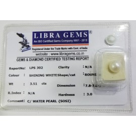 REPORT.NO.-LPS 302CLARITY.-N/ACOLOUR.-SHINING WHITESHAPE/CUT.-ROUNDWT.-3.51 CTSDIMENSION.-7-8.7-8.7-9.R.INDEX.-N/AHARDNESS.-3.0COMMENT.-C / WATER PEARL [ SOSI }..