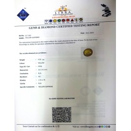 REPORT NO . LY 283CLARITY . N/ACOLOUR . YELLOWSHAPE / CUT . OVALWT . 4.28 CTSDIMENSION . 9-8.8-3.5-6.R . INDEX . 1.76-1.78HARDNESS . 9.0COMMENT . YELLOW SAPPHIRE..