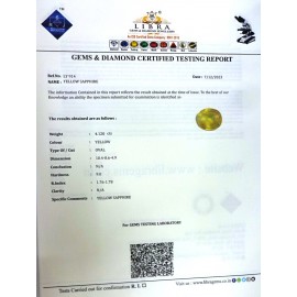 REPORT.NO.LY 592CLARITY.N/ACOLOUR.YELLOWSHAPE/CUT.OVAL WT.3.76 CTSDIMENSION.10.5-8.1-4.5R.INDEX.1.76-1.7.8HARDNESS.9.0COMMENT.YELLOW SAPPHIRE..