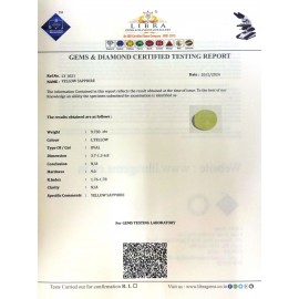 REPORT.NO.-LY 706CLARITY.-N/ACOLOUR.-YELLOWSHAPE/CUT.-OVALWT.-6.46 CTSDIMENSION.-2-1.10-4.4-1.R.INDEX.-1.76-1.78HARDNESS.-9.0COMMENT.-YELLOW SAPPHIRE..