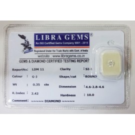 DATE:20-7-2024REF.NO:LDM 121NAME:DIAMONDWEIGHT:0.28 CTSCOLOUR:G-JTYPE OF/CUT:ROUNDDIMENSION:4-2.4-2.2-5.CONCLUSION:N/AHARDNESS:10.0R.INDEX:2.42CLARITY:SI1SPECIFIC COMMENTS:DIAMOND..