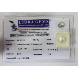 REPORT NO . LP 1112CLARITY . N/ACOLOUR . SHINING WHITESHAPE / CUT . ROUNDWT . 4.17 CTSDIMENSION . 9-3.6-8.9-3.R . INDEX . N/AHARDNESS . 3.0COMMENT . PEARL..