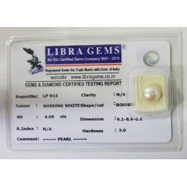 REPORT.NO-LP 915CLARITY-N/ACOLOUR-SHINING WHITESHAPE/CUT-ROUNDWT-4.09 CTSDIMENSION-9.1-8.9-6.4R.INDEX-N/AHARDNESS-3.0COMMENT-PEARL..