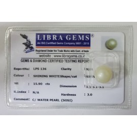 REPORT NO . LPS 136CLARITY . N/ACOLOUR . SHINING WHITESHAPE / CUT . ROUNDWT . 15.90 CTSDIMENSION . 3-1.3-1.3-1.R . INDEX . N/AHARDNESS . 3.0COMMENT  . C / WATER PEARL { SOSI }..