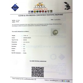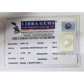REPORT NO . LPSC 26CLARITY . N/ACOLOUR . SHINING WHITESHAPE / CUT . ROUNDWT . 4.90 CTSDIMENSION . 8-6.9-7.8-6.R . INDEX . N/AHARDNESS . 3.0COMMENT . PEARL { SOUTH SEA }..