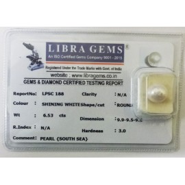 REPORT.NO.LPSC 188CLARITY.N/ACOLOUR.SHINING WHITESHAPE/CUT.ROUND WT.6.53 CTSDIMENSION.9.9-9.5-9.5R.INDEX.N/AHARDNESS.3.0COMMENT.PEARL {SOUTH SEA}..