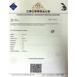 DATE:20-7-2024REF.NO:LDM 108NAME:DIAMONDWEIGHT:0.29 CTSCOLOUR:G-JTYPE OF/CUT:ROUNDDIMENSION:4-3.4-3.2-6.CONCLUSION:N/AHARDNESS:10.0R.INDEX:2.42CLARITY:SI1SPECIFIC COMMENTS:DIAMOND..