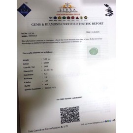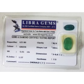 REPORT NO . LEJ 80CLARITY . N/ACOLOUR . GREENSHAPE / CUT . OVALWT . 5.01 CTSDIMENSION . 3-6.8-7.6-3.R . INDEX . 1.57HARDNESS . 7.5COMMENT . EMERALD { J }..