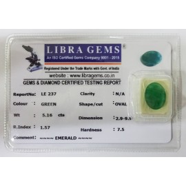 REPORT.NO.-LE 237CLARITY.-N/ACOLOUR.-GREENSHAPE/CUT.-OVALWT.-5.16 CTSDIMENSION.-2-9.9-9.5-8.R.INDEX.-1.57HARDNESS.-7.5COMMENT.-EMERALD..