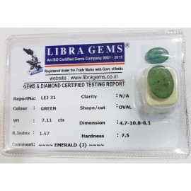 REPORT NO . LEJ 31CLARITY . N/ACOLOUR . GREENSHAPE / CUT . OVALWT . 7.11 CTSDIMENSION . 4-7.10-8.6-1.R . INDEX . 1.57HARDNESS . 7.5COMMENT . EMERALD ..