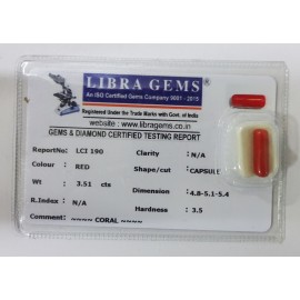 REPORT NO . LCI 190CLARITY . N/ACOLOUR . REDSHAPE / CUT . CAPSULEWT . 3.51 CTSDIMENSION . 4-8.5-1.5-4.R . INDEX . N/AHARDNESS . 3.5COMMENT . CORAL..