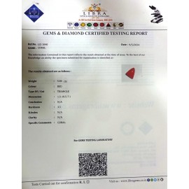 REPORT NO . LCI 71CLARITY . N/ACOLOUR . REDSHAPE / CUT . TRIANGLEWT . 3.27 CTSDIMENSION . 1-9.9-8.4-9.R . INDEX . N/AHARDNESS 3.5COMMENT . CORAL...