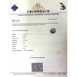 REPORT.NO.LC 307CLARITY.N/ACOLOUR.GREENSHAPE/CUT.OVALWT.9.67 CTS DIMENSION.3.2-1.4-9.1R.INDEX.1.54-1.55HARDNESS.7.5COMMENT.CATS EYE {S.QUARTZ}..