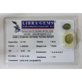 REPORT NO . LC 44CLARITY . N/ACOLOUR . L . GREENSHAPE / CUT . OVALWT . 4.82 CTSDIMENSION . 1-2.9-4.6-7.R . INDEX . 1.54-1.55HARDNESS . 7.5COMMENT . CATS EYE { S . QUARTZ }..