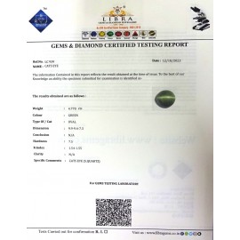 REPORT NO . LC 178CLARITY . N/ACOLOUR . L . GREENSHAPE / CUT . ROUNDWT . 4.44 CTSDIMENSION . 10-1.9-5.6-6.R . INDEX . 1.54-1.55HARDNESS . 3.0COMMENT . CATS EYE { S . QUARTZ }..