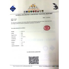 REPORT NO . LRA 21CLARITY . N/ACOLOUR . PINKSHAPE / CUT . OVALWT . 4.67 CTSDIMENSION . 2-4.9-6.3-8.R . INDEX . 1.76-1.78HARDNESS . 9.0COMMENT . RUBY { A }..