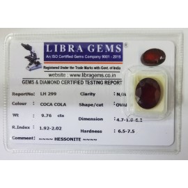 REPORT.NO.-LH 299CLARITY.-N/ACOLOUR.-COCA COLASHAPE/CUT.-OVALWT.-9.76 CTSDIMENSION.-4-7.1-9.6-1.R.INDEX.-1.92-2.02HARDNESS.-6.5-7.5COMMENT.-HESSONITE..