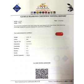 REPORT NO . LCI 278CLARITY . N/ACOLOUR . REDSHAPE / CUT . CAPSULEWT . 3.43 CTSDIMENSION . 4-4.5-1.4-9.R . INDEX . N/AHARDNESS . 3.5COMMENT . CORAL..