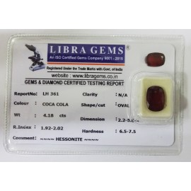 REPORT.NO.-LH 361CLARITY.-N/ACOLOUR.-COCA COLASHAPE/CUT.-OVALWT.-4.18 CTSDIMENSION.-2-2.8-8.4-4.R.INDEX.-1.92-2.02HARDNESS.-6.5-7.5COMMENT.- HESSONITE..