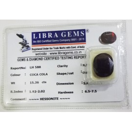 REPORT.NO.-LH 588CLARITY.-N/ACOLOUR.-COCA COLASHAPE/CUT.-OVALWT.-15.36 CTSDIMENSION.-5-6.7-9.R.INDEX.-1.92-2.02HARDNESS.-6.5-7.5COMMENT.-HESSONITE..