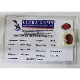 REPORT NO . LH 68CLARITY . N/ACOLOUR . COCA COLASHAPE / CUT . OVALWT . 4.07 CTSDIMENSION . 1-8.8-6.4-5.R . INDEX . 1.92-2.02HARDNESS . 6.5-7.5COMMENT . HESSONITE..