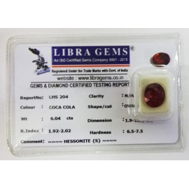 REPORT.NO.LHS 204CLARITY.N/ACOLOUR.COCA COLASHAPE/CUT.OVALWT.6.04 CTSDIMENSION.1.9-10.2-6.2R.INDEX.1.92-2.02HARDNESS.6.5-7.5COMMENT.HESSONITE {S}..