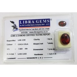 REPORT.NO.LHS 230CLARITY.N/ACOLOUR.COCA COLASHAPE/CUT.OVALWT.7.83 CTSDIMENSION.2.9-10.1-7.3R.INDEX.1.92-2.02HARDNESS.6.5-7.5COMMENT.HESSONITE {S]..