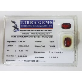 REPORT NO . LHS 79CLARITY . N/ACOLOUR . COCA COLASHAPE / CUT . OVALWT . 3.20 CTSDIMENSION . 10-7.7-6.4-7.R . INDEX . 1.92-2.02HARDNESS . 6.5-7.5COMMENT . HESSONITE { S }..