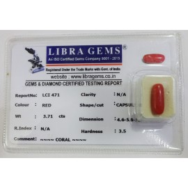 REPORT.NO.-LCI 471CLARITY.-N/ACOLOUR.-REDSHAPE/CUT.-CAPSULEWT.-3.71 CTSDIMENSION.-4.6-5.9-5.1R.INDEX.-N/AHARDNESS.-3.5COMMENT.-CORAL..