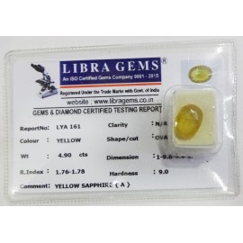REPORT.NO.-LYA 161CLARITY.-N/ACOLOUR.-YELLOWSHAPE/CUT.-OVALWT.-4.90 CTSDIMENSION.-1-9.8-9.4-2.R.INDEX.-1.76-1.78HARDNESS.-9.0COMMENT.-YELLOW SAPPHIRE { A }..