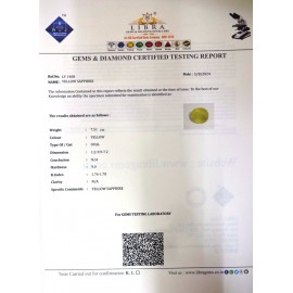 REPORT.NO.LYS 132CLARITY.N/A COLOUR.L.YELLOW SHAPE/CUT.OVAL WT.4.47 CTS DIMENSION.10.8-8.1-4.8 R.INDEX.1.76-1.78HARDNESS.9.0COMMENT.YELLOW SAPPHIRE {S}..