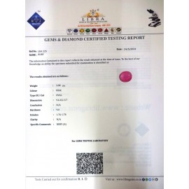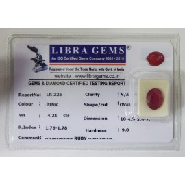 REPORT NO . LR 225CLARITY . N/ACOLOUR . PINKSHAPE / CUT . OVALWT . 4.21 CTSDIMENSION . 10-4.8-3.4-7.R . INDEX . 1.76-1.78HARDNESS . 9.0COMMENT . RUBY..