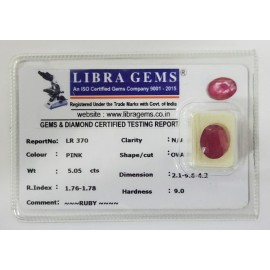 REPORT.NO.-LR 370CLARITY.-N/ACOLOUR.-PINKSHAPE/CUT.-OVALWT.-5.05 CTSDIMENSION.-2.1-9.6-4.2R.INDEX.-1.76-1.78HARDNESS.-9.0COMMENT.-RUBY..
