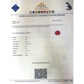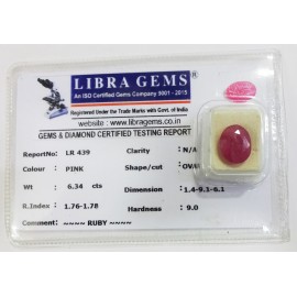 REPORT.NO.-LR 439CLARITY.-N/ACOLOUR.-PINKSHAPE/CUT.-OVALWT.-6.34 CTSDIMENSION.-1-4.9-1.6-1.R.INDEX.-1.76-1.78HARDNESS.-9.0COMMENT.-RUBY..