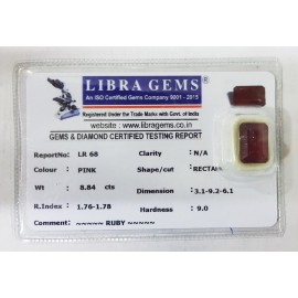 REPORT NO . LR 68CLARITY . N/ACOLOUR . PINKSHAPE / CUT . RECTANGLEWT . 8.84 CTSDIMENSION . 3-1.9-2.6-1.R . INDEX . 1.76-1.78HARDNESS . 9.0COMMENT . RUBY..