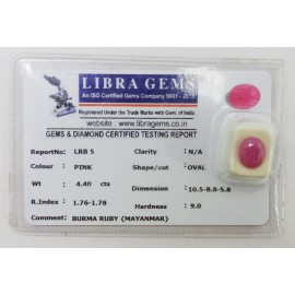 REPORT NO . LRB 5CLARITY . N/ACOLOUR . PINKSHAPE / CUT . OVALWT . 4.40 CTSDIMENSION . 10-5.8-8.5-8.R . INDEX . 1.76-1.78HARDNESS . 9.0COMMENT . BURMA RUBY { MAYANMAR }..