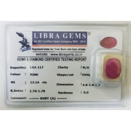 REPORT.NO.-LRA 117CLARITY.-N/ACOLOUR.-PINKSHAPE/CUT.-OVALWT.-13.24 CTSDIMENSION.-4-8.1-4.7-7.R.INDEX.-1.76-1.78HARDNESS.-9.0COMMENT.-RUBY { A }..