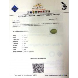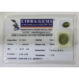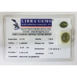 REPORT NO . LC 42CLARITY . N/ACOLOUR . L . GREENSHAPE / CUT . OVALWT . 6.55 CTSDIMENSION . 2-9.10-9.6-7.R . INDEX . 1.54-1.55HARDNESS . 7.5COMMENT . CATS EYE { S . QUARTZ }..