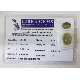 REPORT NO . LC 120CLARITY . N/ACOLOUR . L . GREENSHAPE / CUT . OVALWT . 9.48 CTSDIMENSION . 4-3.1-2.8-1.R . INDEX . 1.54-1.55HARDNESS . 7.5COMMENT . CATS EYE { S . QUARTZ }..