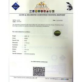 DATE:13-10-2023REF.NO:LC 994NAME:CATS EYE WEIGHT:6.56 CTSCOLOUR:GREENTYPE OF/CUT:OVALDIMENSION:1.8-9.6-8.4CONCLUSION:N/AHARDNESS:7.5R.INDEX:1.54-1.55CLARITY:N/ASPECIFIC COMMENTS:CATS EY..
