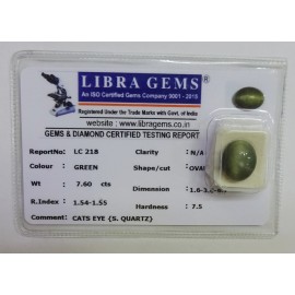 REPORT NO . LC 218CLARITY . N/ACOLOUR . GREENSHAPE / CUT . OVALWT . 7.60 CTSDIMENSION . 1-6.3-6.6-7.R . INDEX . 1.54-1.55HARDNESS . 7.5COMMENT . CATS EYE { S . QUARTZ }..