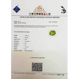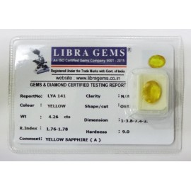 REPORT.NO.-LYA 141CLARITY.-N/ACOLOUR.-YELLOWSHAPE/CUT.-OVALWT.-4.26 CTSDIMENSION.-1-3.8-7.4-2.R.INDEX.-1.76-1.78HARDNESS.-9.0COMMENT.-YELLOW SAPPHIRE { A ]..