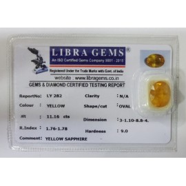 REPORT NO . LY 282CLARITY . N/ACOLOUR . YELLOWSHAPE / CUT . OVALWT . 11.16 CTSDIMENSION . 3-1.10-8.8-4.R . INDEX . 1.76-1.78HARDNESS . 9.0COMMENT . YELLOW SAPPHIRE..