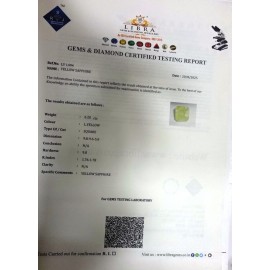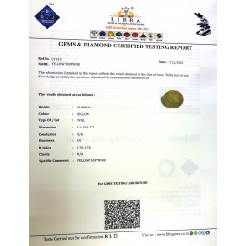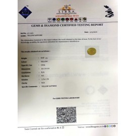 REPORT NO . LY 39CLARITY . N/ACOLOUR . YELLOWSHAPE / CUT . OVALWT . 6.46 CTSDIMENSION . 1-9.9-7.5-7.R . INDEX . 1.76-1.78HARDNESS . 9.0COMMENT . YELLOW SAPPHIRE..