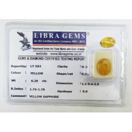 REPORT.NO.LY 593CLARITY.N/ACOLOUR.YELLOWSHAPE/CUT.OVAL WT.6.29 CTSDIMENSION.2.1-9.4-5.9R.INDEX.1.76-1.7.8HARDNESS.9.0COMMENT.YELLOW SAPPHIRE..