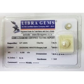 REPORT NO . LP 1005CLARITY . N/ACOLOUR . SHINING WHITESHAPE / CUT . ROUNDWT . 4.08 CTSDIMENSION . 8-9.8-8.6-6.R . INDEX . N/AHARDNESS . 3.0COMMENT . PEARL..