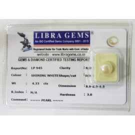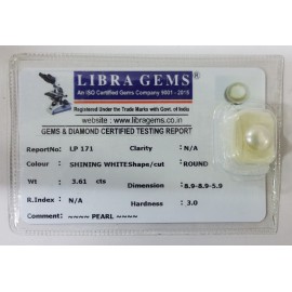 REPORT . NO . LP 171CLARITY . N/ACOLOUR . SHINING WHITESHAPE / CUT . ROUNDWT . 3.61 CTSDIMENSION . 8-9.8-9.5-9.R . INDEX . N/AHARDNESS . 3.0COMMENT . PEARL..