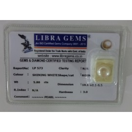 REPORT NO . LP 573CLARITY . N/ACOLOUR . SHINING WHITESHAPE / CUT . ROUNDWT . 5.88 CTSDIMENSION . 10-1.10-1.6-5.R . INDEX . N/AHARDNESS . 3.0COMMENT . PEARL..