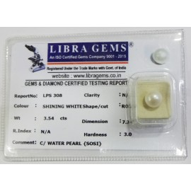 REPORT.NO.-LPS 308CLARITY.-N/ACOLOUR.-SHINING WHITESHAPE/CUT.-ROUNDWT.-3.54 CTSDIMENSION.-7-7.7-8.7-8.R.INDEX.-N/AHARDNESS.-3.0COMMENT.-C / WATER PEARL { SOSI }..