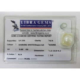 REPORT NO . LP 236CLARITY . N/ACOLOUR . SHINING WHITESHAPE / CUT . ROUNDWT . 9.60 CTSDIMENSION . 1-5.10-9.9-2.R . INDEX . N/AHARDNESS . 3.0COMMENT . PEARL..